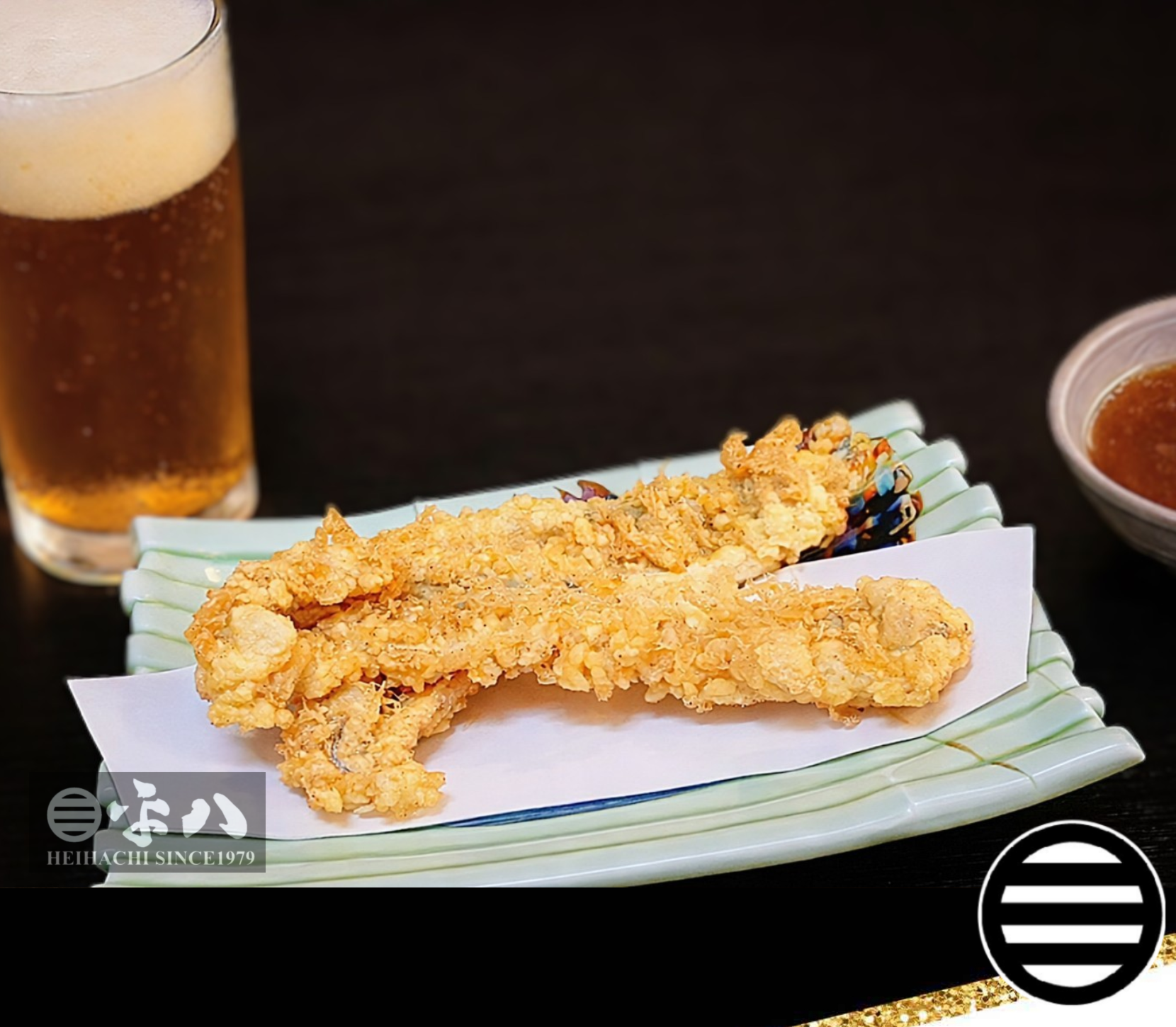 江戸前の主たる食材にて、古よりその中央に座する穴子…本日は鮮度抜群で特大の穴子を、天ぷらにてご提供させて頂きます。淡白な旨味の中にも、しっかりと脂の乗った穴子の、芳ばしい揚げ立ての天ぷらを、創業時よりこだわり続ける平八特製の天つゆにて、是非ともご賞味下さい。